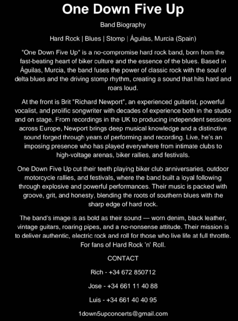 "One Down Five Up" is a no-compromise hard rock band, born from the fast-beating heart of biker culture and the essence of the blues. Based in Águilas, Murcia, the band fuses the power of classic rock with the soul of delta blues and the driving stomp rhythm, creating a sound that hits hard and roars loud. At the front is Brit "Richard Newport", an experienced guitarist, powerful vocalist, and prolific songwriter with decades of experience both in the studio and on stage. From recordings in the UK to producing independent sessions across Europe, Newport brings deep musical knowledge and a distinctive sound forged through years of performing and recording. Live, he's an imposing presence who has played everywhere from intimate clubs to high-voltage arenas, biker rallies, and festivals. One Down Five Up cut their teeth playing biker club anniversaries, outdoor motorcycle rallies, and festivals, where the band built a loyal following through explosive and powerful performances. Their music is packed with groove, grit, and honesty, blending the roots of southern blues with the sharp edge of hard rock. The band's image is as bold as their sound - worn denim, black leather, vintage guitars, roaring pipes, and a no-nonsense attitude. Their mission is to deliver authentic, electric rock and roll for those who live life at full throttle. For fans of Hard Rock 'n' Roll. - Hard Rock | Blues | Stomp | Águilas, Murcia (Spain) Contact Rich: +34 672 850712 - Jose:+34 661 11 40 88 - Luis: +34 661 40 40 95